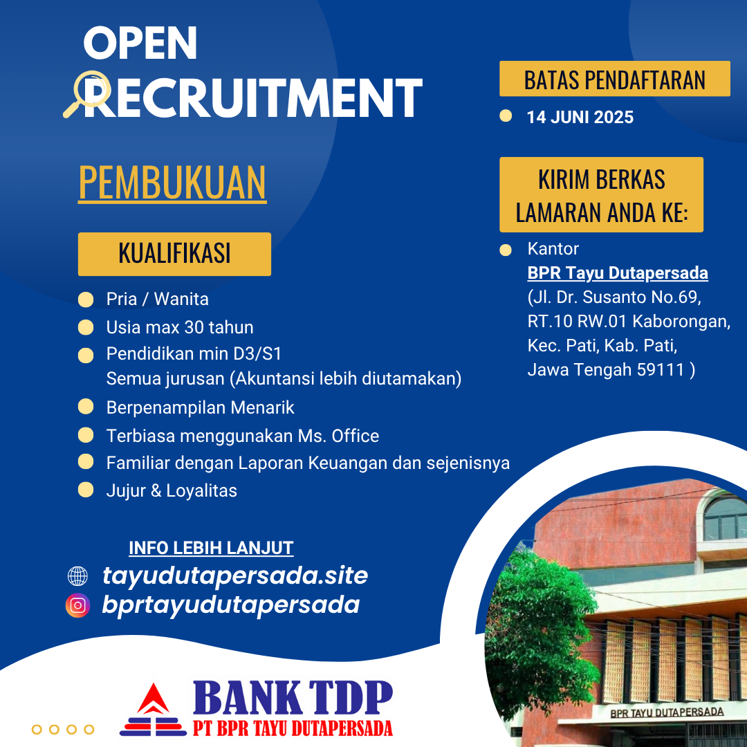 - *Kirim berkas lamaran anda langsung ke kantor BPR Tayu Dutapersada di Jl. P. Diponegoro No.57, RT.02 RW.02 Winong,Kec. Pati, Kab.Pati,Jawa Tengah 59112